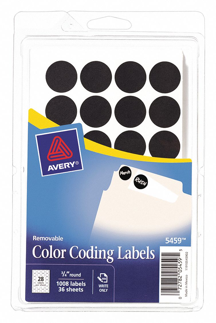 Avery Hand Written Color Coding Labels, 3/4" Dia., Black, 28/Sheet, 36 ... Color-coding labels are ideal for priority messages, color coding, and more Round 3/4" diameter labels Comes in black Removable adhesive for residue-free cleanup 28 labels per sheet, 36 sheets per pack; 1008 total labels Would you like to give feedback on product content, images, or tell us about a lower price? Provide feedback top